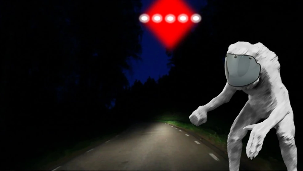 Rossien initially took the entity with its 'curious loping walk' to be an unfortunate human struggling down a bank on the left side of the road, but he also noted that an ordinary person should've had considerably more difficulty navigating the treacherous terrain in the dark. As he drove past the figure, he briefly caught it in his headlights and was thus able to get a better look at it - and what he saw would certainly not be something he was going to forget in a hurry. He hardly had a chance to slow down by the time that he realised what he was seeing.